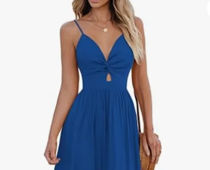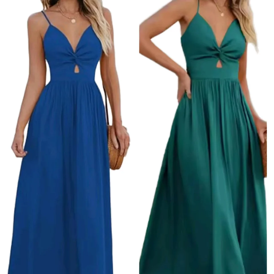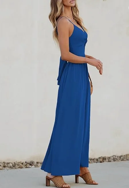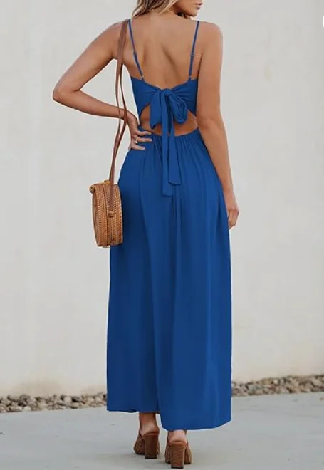 Summer Women's Casual Long Sundress Sleeveless V-Neck with Hollow Out Thin Shoulder Strap Midi Length Formal Natural Waistline